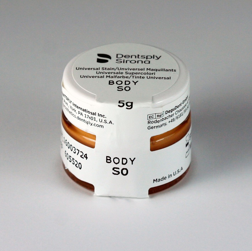 Farvepasta til individuel karakterisering af tandrestaureringer og f.eks. Tessera blokke. Tilgængelig i nuancerne S0 til S4, hvilket giver mulighed for præcis tilpasning til patientens naturlige tandfarve. Påføres i et tyndt lag på restaureringens eller kronens overflade og brændes efterfølgende i en keramisk ovn for at opnå den ønskede æstetik. Farve S0, i krukke/glas.