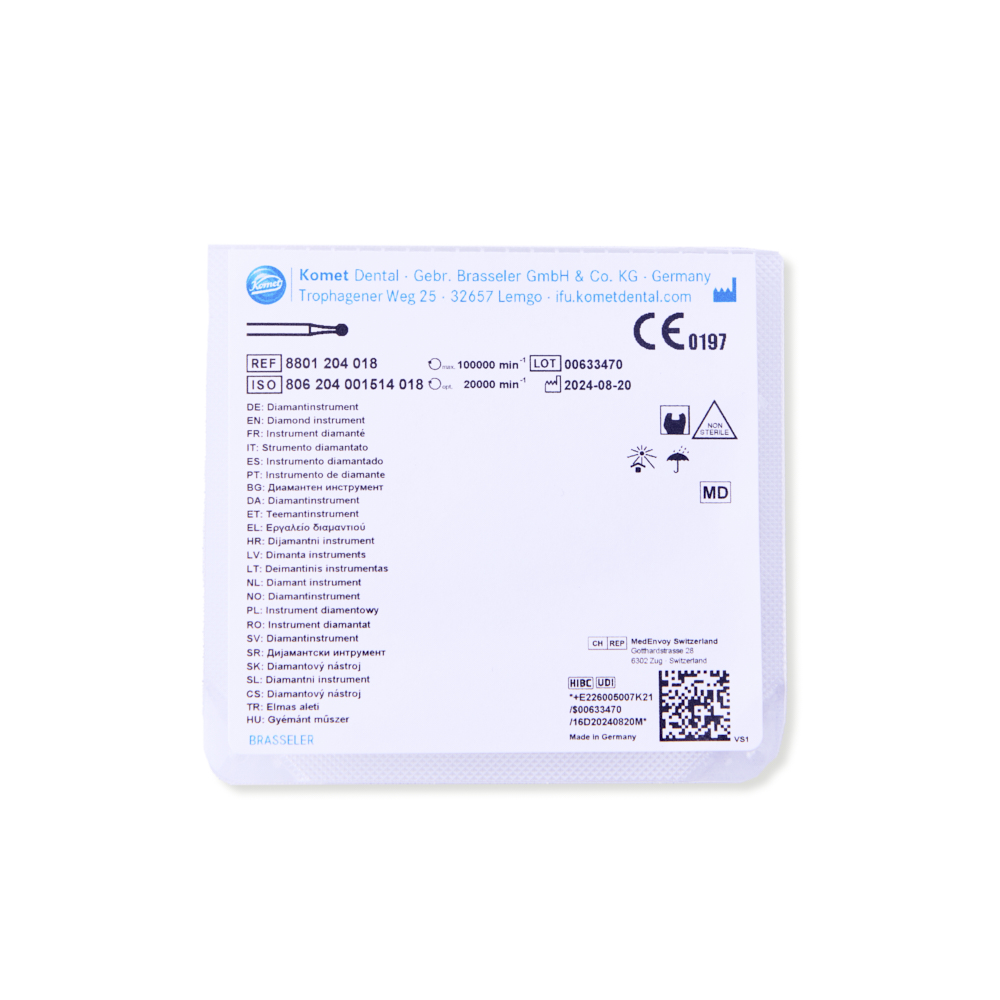 Diamantbor til præparation og pudsning, til RA, rund, fin med rød ring, tykkelse 018, længde på hovedet 1,8 mm. 8801.204.018.
