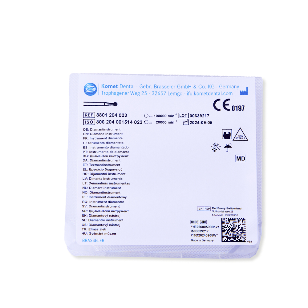 Diamantbor til præparation og pudsning, til RA, rund, fin med rød ring, tykkelse 023, længde på hovedet 2,3 mm. 8801.204.023.