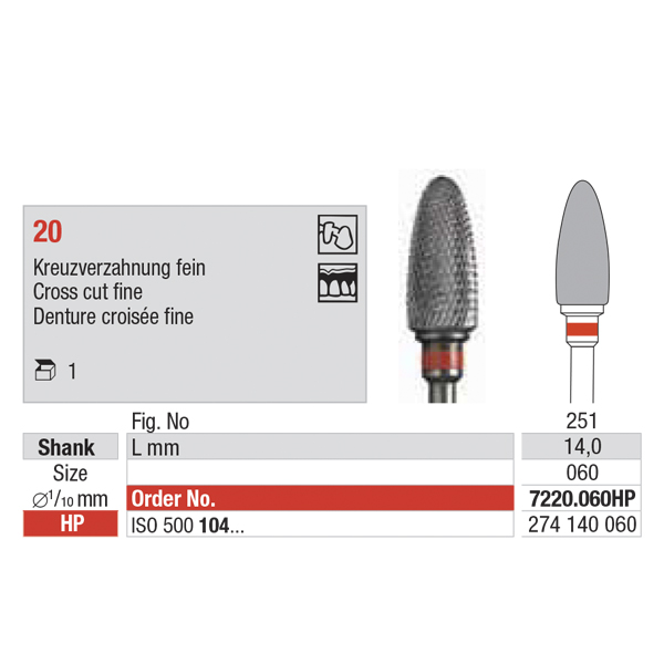 Akrylfræser i hårdmetal, krydsbundet, fin med rød ring, til HP, 251/060, længde på den arbejdende del 14,0 mm.