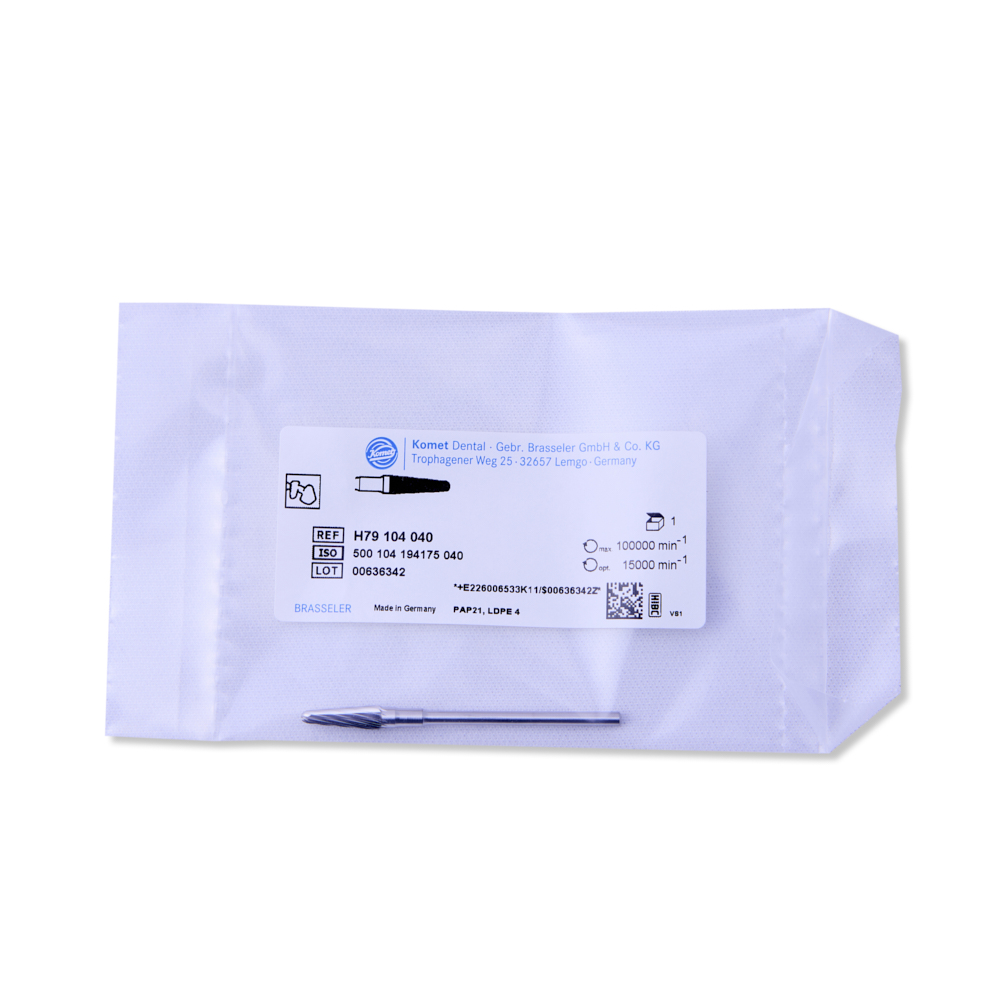 Hårdmetal akrylfræser, konisk med afrundet top og snoede, glatte skær, til HP, længde arbejdende del 13 mm, H79.104.040.