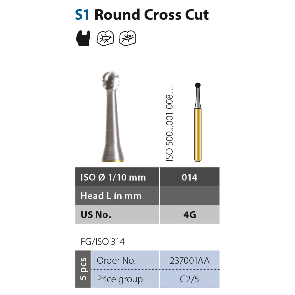 Skrubfræsere i hårdmetal, til FG, guldfarvede, runde med tværhug, S1-014 (4G), hovedhøjde 1,4 mm.