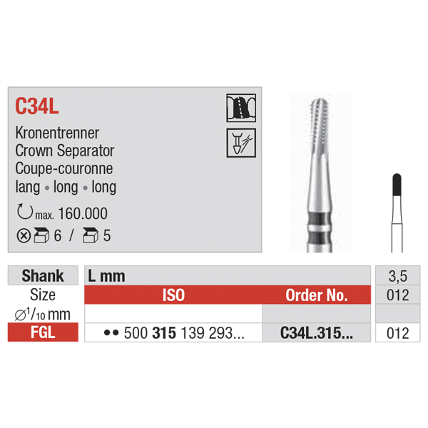 Forlænget hårdmetalbor til FG, kronedeler/Crown Cutter, L med forlænget skaft, str. 012, til krone-deling, med 2 grå ringmarkeringer, længde på hovedet 3,5 mm.