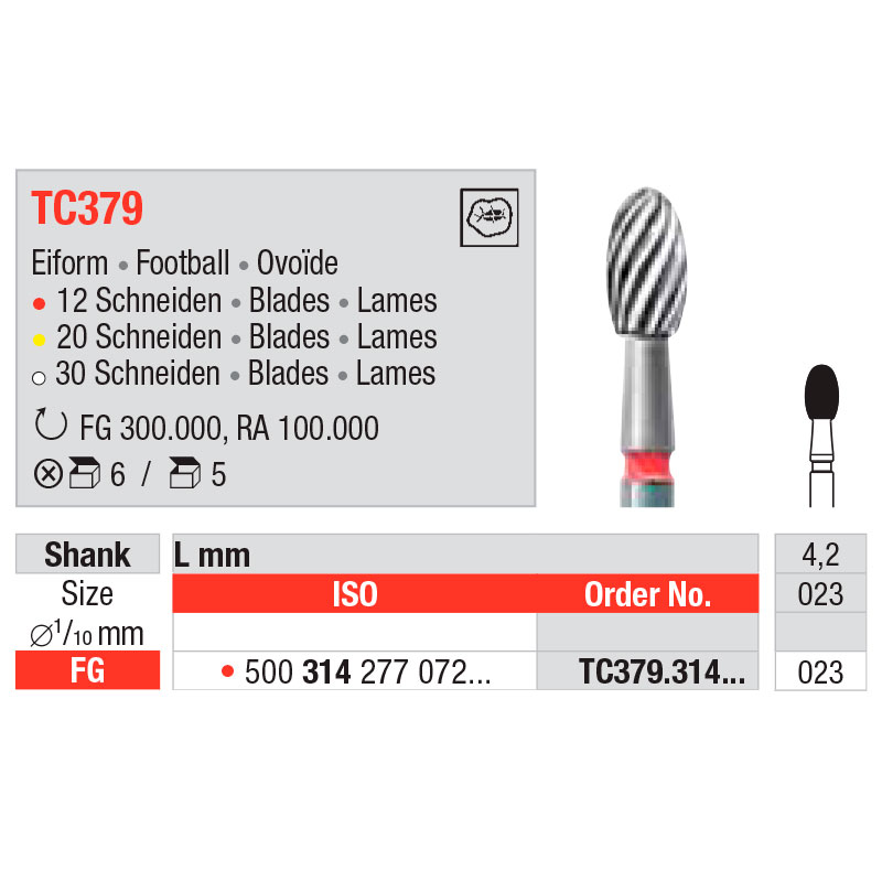 Finerbor i hårdmetal, til FG, æg-formet, 12-bladet med rød ring, længde på den arbejdende del 4,2 mm, TC379/023.