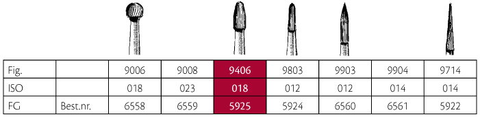 Hårdmetalbor til pudsning, guldfarvede, 30-bladede, til FG, æg-formet, 9406/018, hovedhøjde 3,4 mm.