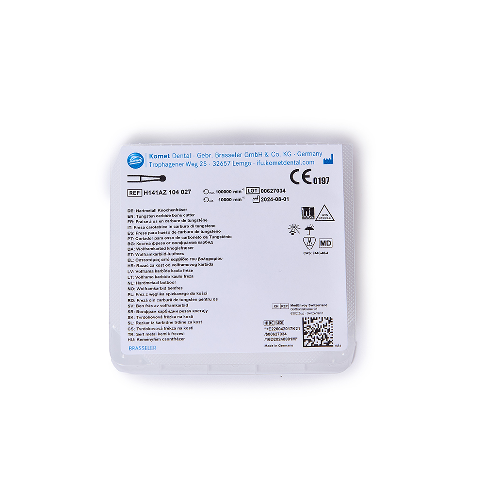 Komet HM fræser H141AZ. Rund hårdmetal knoglefræserbor med dobbelt krydsslebet skær. AZ-serien er en serie af instrumenter som er coatet med et specielt Zirkonium Nitrid lag (1-2my), på den arbejdende del (arbejdsdelen er guldfarvet), og dette beskytter instrumentet bedre mod div. desinfektionsvæsker og holder derved længere. Anvendes til kirurgisk fjernelse af knogle. Tåler autoklavering. Til håndstykket. HP. H141AZ.104.027
