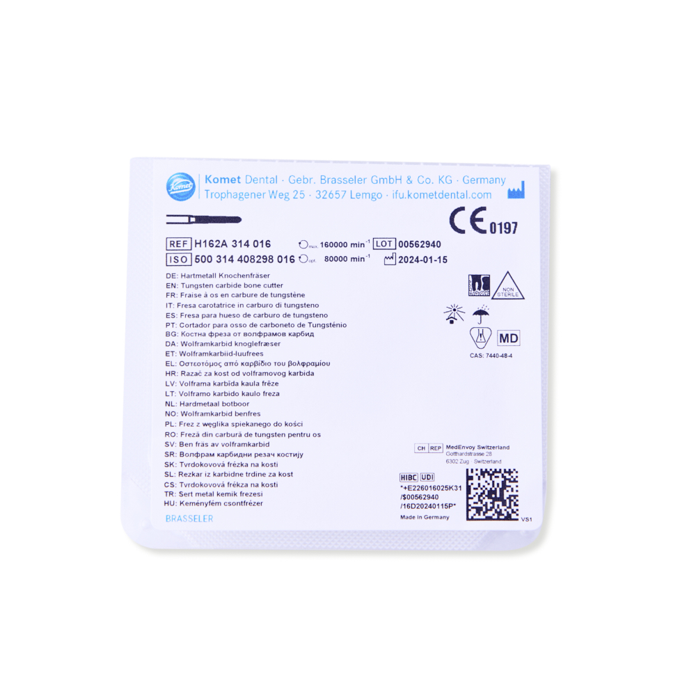 Komet HM Lindemann fræser H162A. Komet hårdmetal knoglefræserbor, konisk med dobbelt krydsslebet skær. Anvendes til deling af tand/rodsokkel og fjernelse af knoglevæg. Længde 9mm. Til airrotor. H162A.314.016