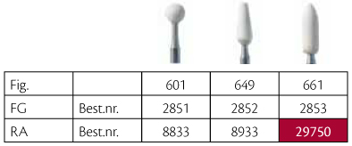 Slibesten til komposit, til RA, nr. 661, XF ekstra fin, hvid, cylindrisk med konisk spids, str. 025. Omdrejninger max 160.000/min.
