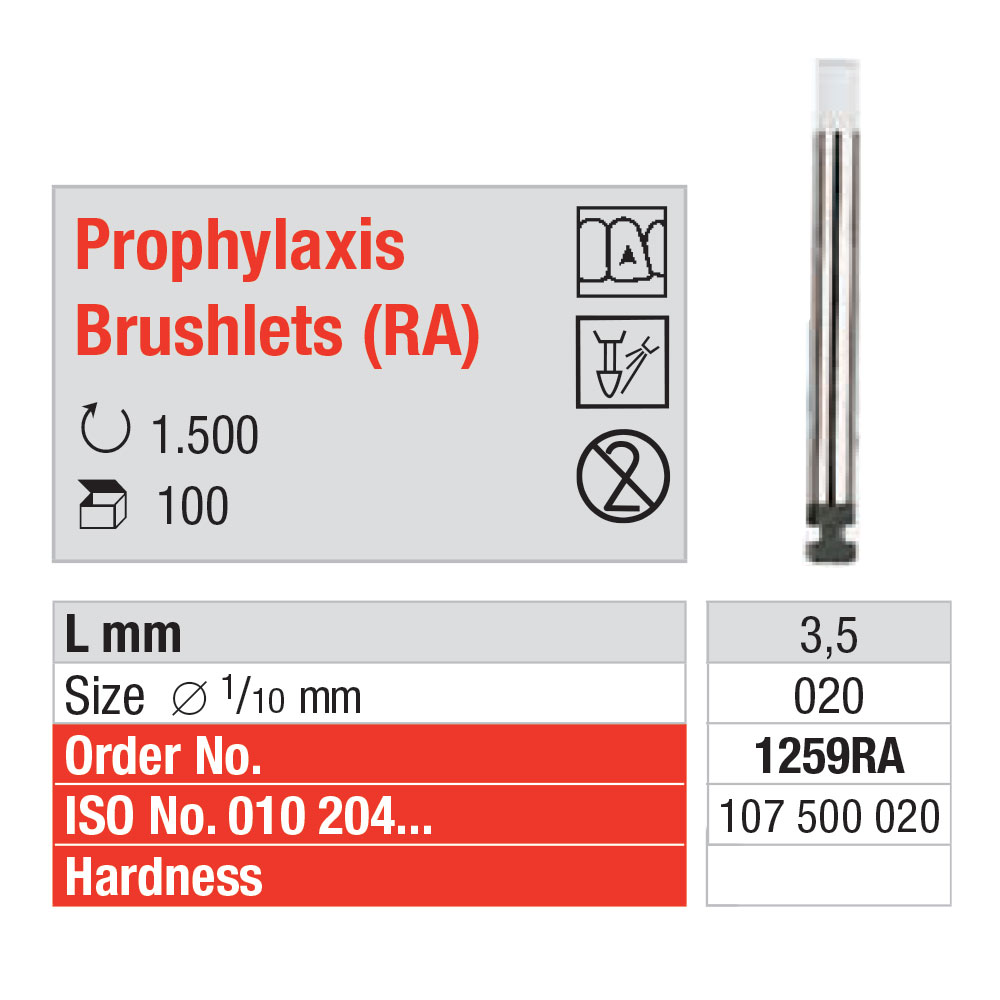 Nylonbørster til RA, til fjernelse af plak på okklusalflade og cusp, kan pga. stor fleksibiliet bruges til rengøring under tandkødskanten, hvid medium, med lille flad børste, tykkelse 020.