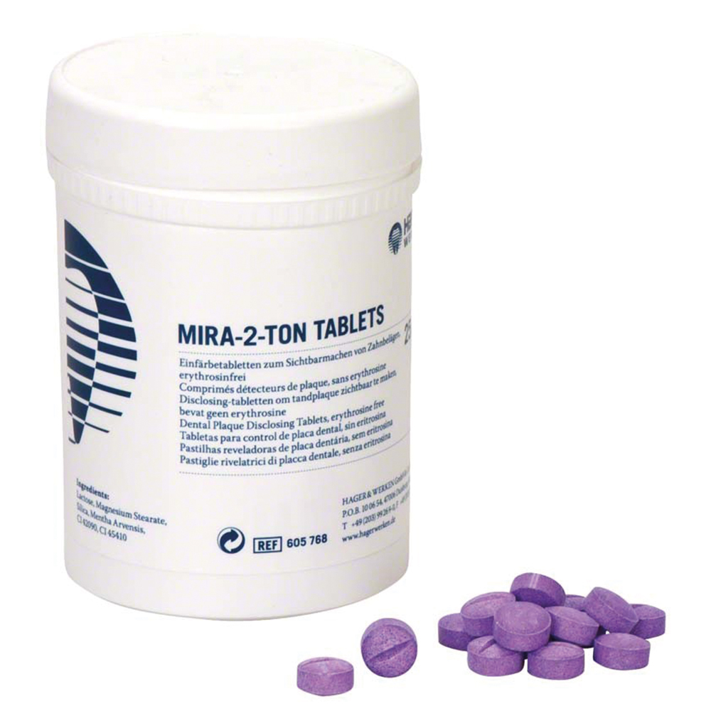 Tyggetabletter, der synliggør plak. Farven er nem at fjerne ved almindelig tandbørstning. Ældre plak vises med blå farve, nyere plak farves pink. En tablet kan deles i 2.