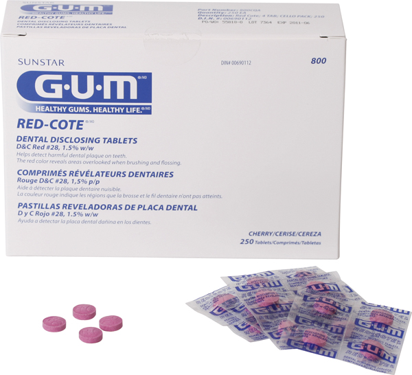 Farvetabletter, røde, med kirsebærsmag, er pakket enkeltvis.