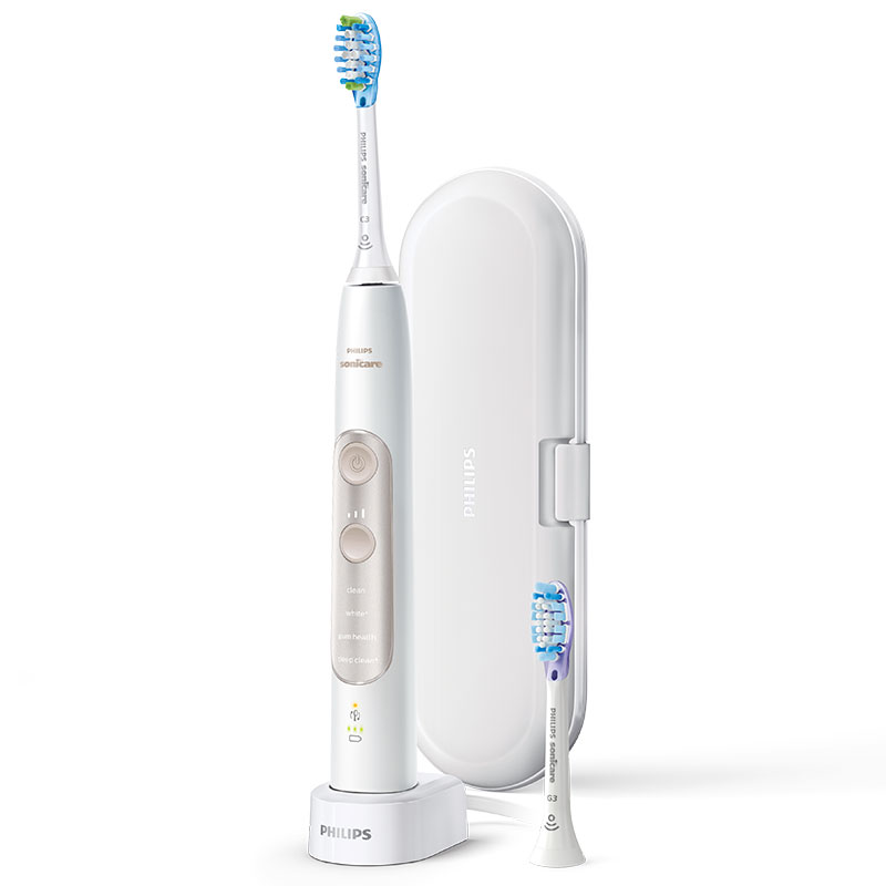 Eltandbørste, rosegold, med patenteret sonisk teknologi og 4 indstilling samt 3 intensitetsniveauer, fjerner op til 7 gange mere plak sammenlignet med en manuel tandbørste. Med genopladeligt batteri, der holder op til 2 uger, samt 2 børstehoveder. 62.000 bevægelser/minut, med tryksensor, indikation for skift af børstehoved samt mulighed for connection med app.