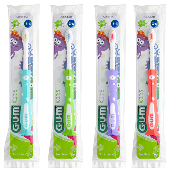 Tandbørster, nr. 901, børn 3-6 år, blød, 3 rækker børstebundter, med sugekop på enden af skaftet, så den kan stå, i cellofanpakninger.