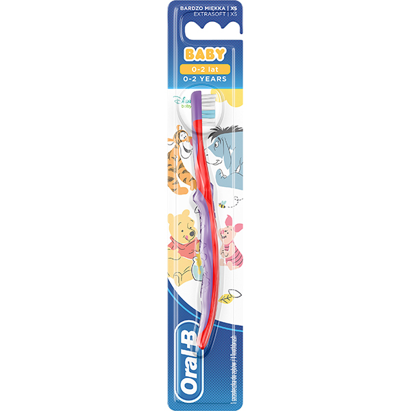 Tandbørster, Baby 0-2 år, Stages 4-24 mdr., X-blød, 5 rækker børstebundter, Indicator børstehår, kraftig greb med gummibelægning, Peter Plys motiv på skaftet. 03014260426323