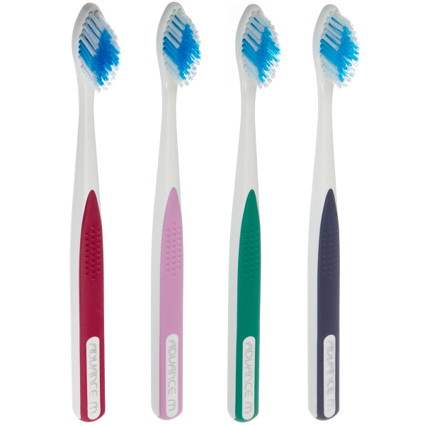 Tandbørster, Advance, medium, 3 rækker børstebundter, rombeformet børstehoved med blå kerne og skaft med gummibelægning.