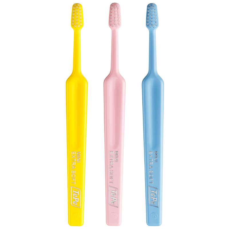 Tandbørste til børn fra 0-3 år, med lille, konisk børstehoved, som kan vinkles, afrundede børstehår samt ergonomisk skaft, Mini, x-soft, pakket enkeltvis i cellofan pakninger.