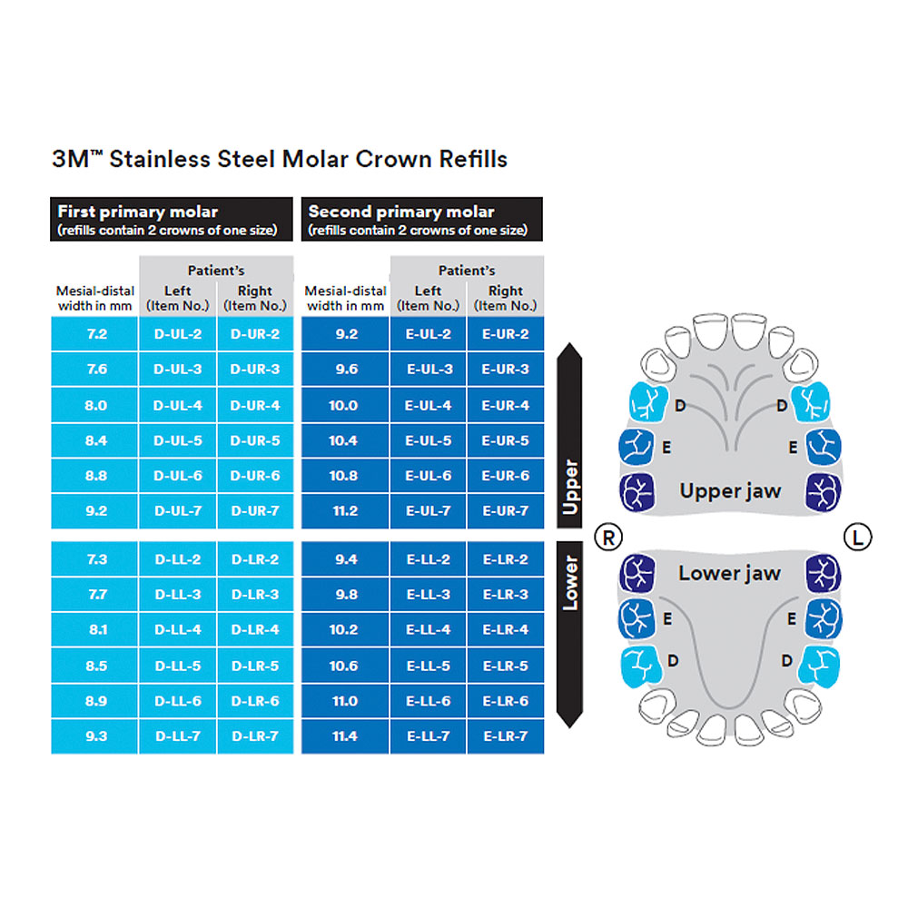 Stålkroner til første primære molar, anatomisk udformede kroner, der er nemme at tilpasse og adaptere, kan anvendes til kort- og langtidsprovisorium på primærer molarer, er præformede ved den cervikale kant for at give god retention og tilpasning. Str. D-UL-2. Diameter mesial-distal: 7,2 mm.
