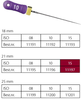 C+ file i rustfrit stål (særligt behandlet stål så filen bliver ultra stiv) med farvet plasthåndtag, anvendes til at skabe adgang til rodkanalen, særligt velegnede til oprensning af calcificerede kanaler, 21 mm, nr. 15, hvid. Ready Steel- sterilt pakket i blisterpakninger.