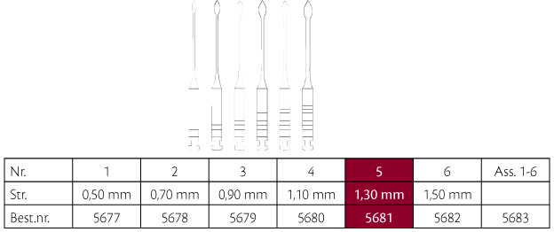 Gates Glidden bor, anvendes til åbning af rodkanalindgange og til crown-down præparationer af rodkanaler, til RA, lang, fuld længde af boret er 32 mm, hoved og hals er 19 mm. Nr. 5 Ø 1,3 mm.