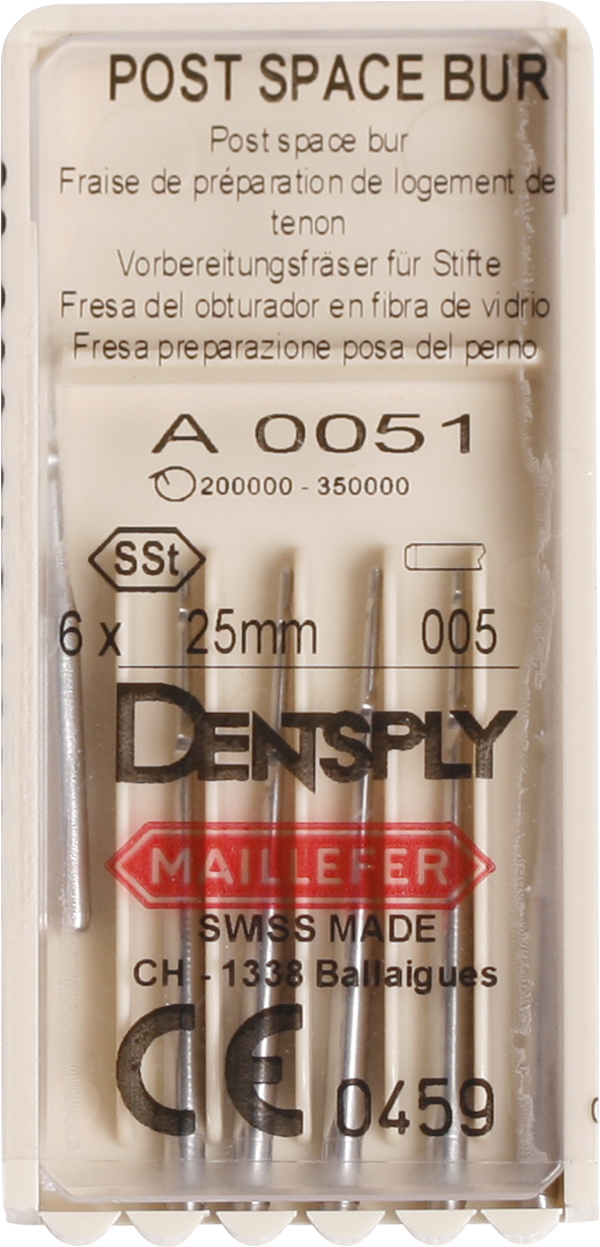 Bor til fjernelse af plastkernen i termoplastiske obturatorer før udboring til stift, langt lige glat bor med indfræset piralfure, til FG, kan også bruges i opgearingsvinkelstykke ved max 300.000 rpm, uden vandspray. OBS: Pas på at boret ikke bliver for varmt. ref. A0051/25MM/005, str. 1, 0,5 mm x 25 mm. Forbor i rustfrit stål til indledende udboring, hvis der er rodfyldt med obturatorer fra f.eks. Thermafil eller Soft-Core. Anvendes hvis obturatoren skal udbores ved evt. rodstift behandling.