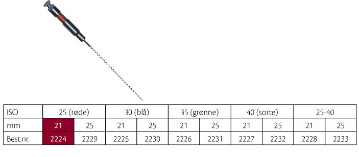 Rodfyldningsspiraler, fleksibel med fjeder-effekt tættest på skaftet, svarer til de tidligere rodspiraler fra VDW, metalskaft, 21 mm, nr. 25, rød.
