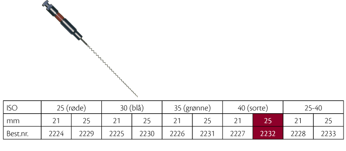 Rodfyldningsspiraler, fleksibel med fjeder-effekt tættest på skaftet, svarer til de tidligere rodspiraler fra VDW, metalskaft, 25 mm, nr. 40, sort.