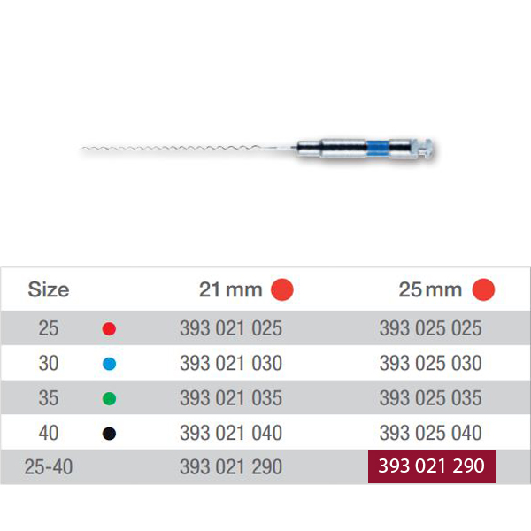 Rodfyldningsspiraler med metalskaft, 25 mm, ass. nr. 25-40. Sterilt enkeltpakkede.