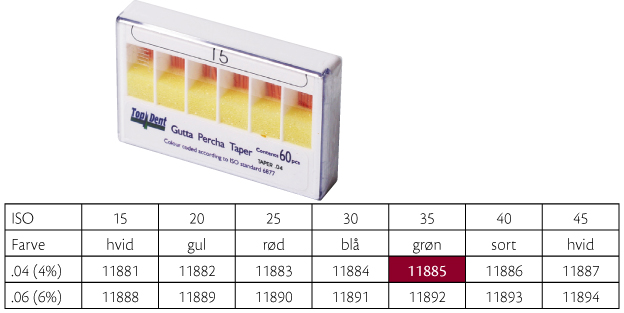 Guttaperkapoints, til rodfyldning hvor der er anvendt fx SystemGT, Profile, Protaper eller andre nikkeltitaniuminstrumenter, farvekodede i toppen, GT .04, 28 mm, nr. 35, grøn.