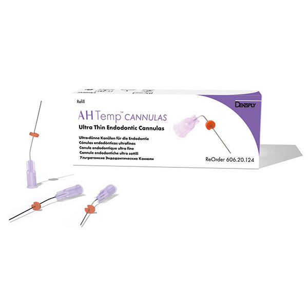 Tynde, bøjede metalkanyler med silikonestop til AH Temp, kanylerne er 25 mm lange og har en ydre diameter på 0,41 mm. Med disse kanyler er det muligt at applicere AH Temp direkte ned i rodkanalen uden brug af rodspiral.