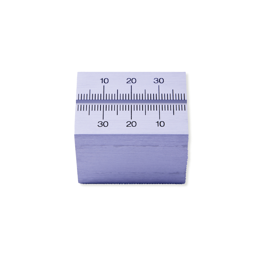 Aluminiumsblok med fure og mm-streger 0-30 mm, 4 x 3 x 3 cm, kan autoklaveres.