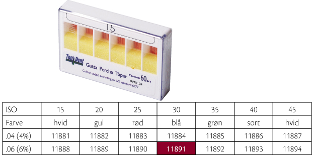 Guttaperkapoints, til rodfyldning hvor der er anvendt fx SystemGT, Profile, Protaper eller andre nikkeltitaniuminstrumenter, farvekodede i toppen, GT .06, 28 mm, nr. 30, blå.