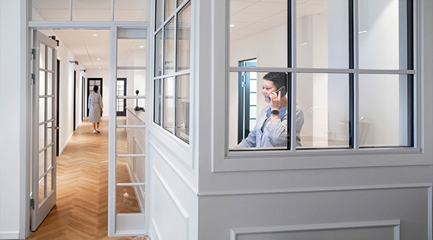 De sprossede vinduer og paneler går igen i receptionen, hvor de skaber afskærmning og arbejdsro, samtidig med at personalet har udsyn til venteværelset.